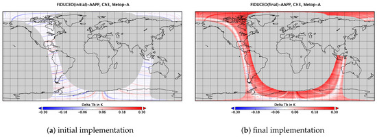 Difference in brightness temperature (channel 3) of FIDUCEO and AAPP processing for an example orbit of Metop-A: (a) for initial implementation that imitates AAPP; and (b) for final implementation with improvements in the calibration to reduce inter-satellite biases.