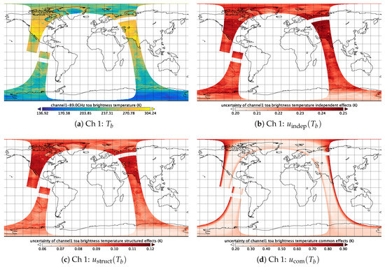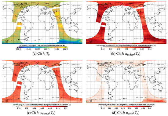 Figure 3 and Figure 4 show the brightness temperature and its uncertainty for channel 1 and 3 of the example orbit of MHS on Metop-B (start: 6 July 2015 15:47:58, end: 6 July 2015 17:29:18). Note the equator-to-equator frame. The two data gaps seen in this orbit are explained by the quality flags. The quality flags are set during our FCDR processing and provide general information on the quality of the pixels and also on channel-specific issues (see [33] for details on the provided quality information in the FCDR). The first data gap close to South America is due to missing data. The second data gap is due to a moon intrusion in the DSVs, which prohibits the calibration of the affected scan lines. Note also the different ranges and distribution patterns for the uncertainty classes. This is discussed in Section 3.3.