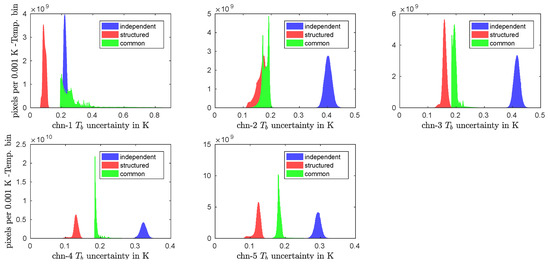 A comparison of the three classes of uncertainties is visible in Figure 5, showing histograms of the respective uncertainties for each class for one month of MHS data (MHS on Metop-B, September 2014). The histograms for the three sounding channels resemble each other, although the exact positions of the distributions vary slightly. For channels 1 and 2, the picture is changed as either the independent and common uncertainties, or the structured and common uncertainties overlap. The long tail for the common effects in channel 1 reaching 0.8 K is due to the antenna pattern correction affecting the outermost pixels most strongly. Most of the data, however, have common uncertainties below 0.3 K also for channel 1. Except for channel 1, the independent uncertainties dominate the other classes. From the perspective of a climate scientist, this is encouraging, as the uncertainty due to independent effects can be reduced by averaging procedures used for climate studies. The smaller, common uncertainties cannot be reduced by averaging, hence, their relative importance increases on longer times scales.