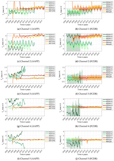 The operational calibration of these instruments’ data (the level 1b to level 1c processing) was done by a software package called AAPP (ATOVS (Advanced TIROS-N (Television InfraRed Operational Satellite—Next-generation) Operational Vertical Sounder) and AVHRR (Advanced Very High Resolution Radiometer) Pre-processing Package) [18]. We reimplemented this entire processing chain, following the AAPP equations in general, but allowing for possible changes to improve the calibration (see Section 2.2.2 for the applied improvements). Improving the calibration was the main goal to produce a consistent FCDR of reduced inter-satellite biases.
