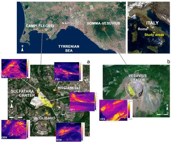 The TIR frames time-series, used to develop and test the methodologies described in this work, were acquired by stations of TIRNet (Thermel InfraRed Network), a surveillance network operated by the Osservatorio Vesuviano, section of National Institute of Geophysics and Volcanology (INGV), consisting of six permanent ground stations installed at Campi Flegrei caldera and Vesuvius crater (Figure 1). Campi Flegrei (CF) is an active volcanic field including part of the city of Napoli (Italy). Nowadays, although quiescent and the last eruption occurred in 1538 (Monte Nuovo; [25]), the CF area is affected by significant ground deformation (Bradyseism), low to moderate seismic activity, hot fumaroles fields and diffuse degassing zones. The target areas acquired by TIR cameras in the Solfatara crater and its surroundings are shown in (Figure 1a). The monitored area represents the main surface expression of the CF caldera hydrothermal system with gases emissions originated by interaction between fluids of magmatic and meteoric origin [26,27,28]. The Somma–Vesuvius volcanic complex, located east of the city of Naples, is one of most dangerous volcanoes in the world and the latest eruption occurred on 1944 [29]. The recent dynamic of the Vesuvius is characterized by low-level shallow seismicity and by low temperature fumarolic activity mainly concentrated in the crater area [30,31,32]. TIR scenes are from low-temperatures surface thermal anomaly on the western inner slope of the Vesuvius crater (Figure 1b).