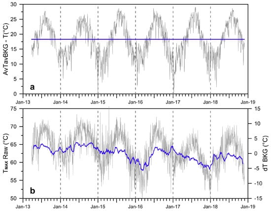 (a) Time-series of average temperature values of Pisciarelli background area (grey color) and linear regression fit (blue color); (b) the results of the background removal procedure applied to Pisciarelli station: RAW maximum temperature of IR scene (grey color) and residual temperature value dT (blue color).