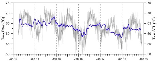 A simple plot of the time-series of temperature values evidenced a typical recurring pattern due to the seasonal influence over the surface temperatures (background raw maximum temperature plot in Figure 3). The temperature time-series of raw IR frames were representative of both exogenous (e.g., seasonal) and endogenous (thermal anomaly) components. Therefore, in order to highlight the possible spatio-temporal variation of thermal anomalies, it was necessary to remove the seasonal component in the raw temperature time-series (de-seasoned time-series).