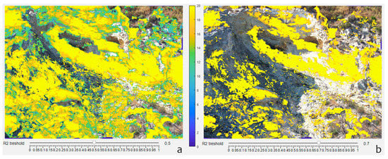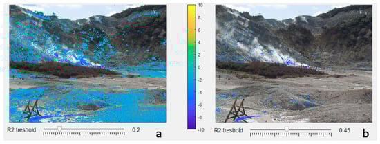 Yearly rate of temperature change maps of SF1 in the period 2016.02.01–2016.11.30. Map (a) has R2 threshold value = 0.2. Map (b) has and R2 threshold value = 0.45. In this time-interval SF1 maximum temperatures decreased of about 10 °C as evidenced by the color map.