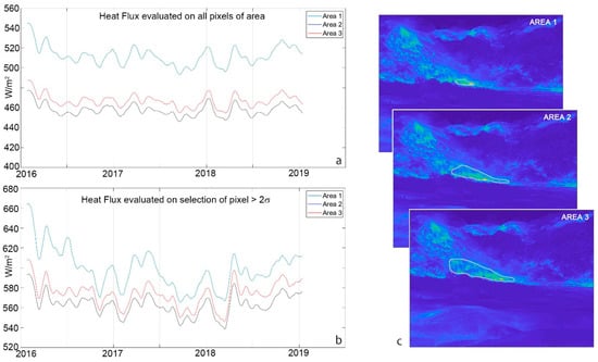 In order to estimate Qrad, which is the thermal energy emitted per unity of area in a unity of time, the RoA has to include pixels whose temperatures are representative of the main thermal anomaly. Nevertheless, the RoA is usually not homogeneous and it is characterized by the presence of both high temperature sources (fumaroles) and low temperature sources (surrounding emission-free rocks). In addition, when sensor-target distance is more than approximately 10 m, the pixels of RoA can be several centimeters large, and therefore, some temperatures are underestimated if their pixels integrate both high and low temperatures [42,43]. Consequently, the variations trend of Qrad can be sensibly flattened. A solution to this problem is to calculate the Standard Deviation (SD) of pixels’ temperatures of a specific RoA and then to use only temperature values (TROAH) greater than 2SD to estimate Qrad.