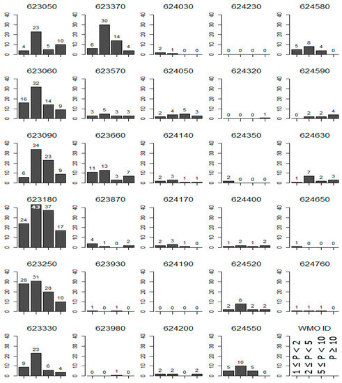 Figure 3 shows bar graphs of the count of rainfall events of the light, low–moderate, high–moderate, and heavy rainfall classes at each station. As shown in Table 2, wet days were rare in most of the stations. The count of “no/tiny rainfall class” event was omitted from the bar graphs as the number of this event was very high compared to other events. This was done in order to show the count of the remaining rainfall intensity classes clearly. At stations 624190 and 624230, only one rainfall event occurred at each station during the study period. Those rainfall events were less than 1 mm (categorized as no/tiny rainfall class), and therefore did not appear in the graphs presented in Figure 3. Table 7 shows the total number of events captured by ground rainfall station for each rainfall intensity class.