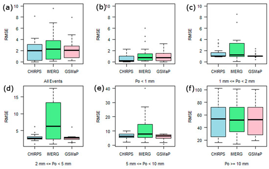 Box plots of Root Mean Square Error (RMSE) of the three satellite-based datasets in the estimation of rainfall amounts for (a) all events, and (b–f) different intensity ranges as shown in the corresponding plot.
