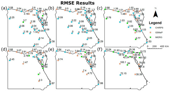 Maps showing the best performing datasets according to RMSE at each station along with the estimated RMSE for the best performing satellite rainfall product for (a) all rainfall events, (b) no/tiny rain, (c) light rain, (d) low–moderate rain, (e) heavy–moderate rain, and (f) heavy rain.