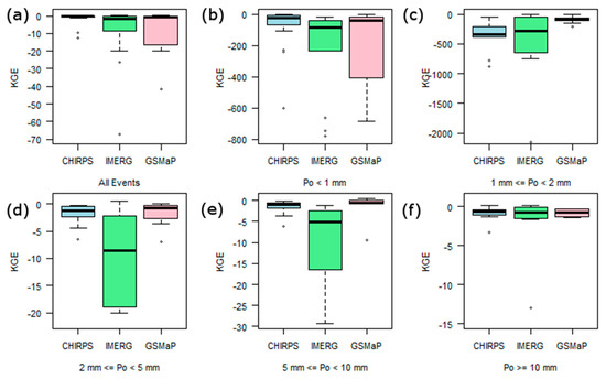 Box plots of Kling–Gupta efficiency (KGE) of the three satellite-based datasets in the estimation of rainfall amount for (a) all events, and (b–f) different intensity ranges as shown in the corresponding plot.