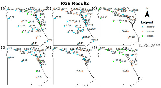 The KGE is a robust index that integrates variability, correlation, and bias into a single index. Figure 6 shows the box plots of KGE of the three satellite rainfall products in estimating rainfall amounts for the all-events class and different rainfall intensity classes. The estimated KGEs for the best performing rainfall products at each station are shown in the maps (Figure 7). For the all-events class, the CHIRPS was found as the best performing satellite-based rainfall product at 16 stations distributed over Egypt with a median KGE equal to 0.59. Although the KGE for GSMaP showed the highest upper range compared to other products, with a median of 0.4, it was found as the best product at 5 stations out of 29. For the no/tiny rain class, CHIRPS and GSMaP shared the same KGE median (0.2), but GSMaP showed a higher spread of KGE in the upper range. Consequently, CHIRPS was found best at 20 out of 29 stations and GSMaP at nine stations. The IMERG was found as the worst for this class. The CHIRPS and IMERG performed badly for the light rain class with a high median of KGE (−336 and −283, respectively). On the other hand, GSMaP showed less KGE, and therefore, was found as the best product at 8 stations out of 16. Similar results were found for the low– and high–moderate rainfall classes, where GSMaP performed better compared to others in most of the stations, with a median KGE of around −0.65. Although the three datasets shared nearly the same median KGE for the heavy rainfall class, IMERG outperformed others at two-thirds of the stations. Overall, according to KGE, GSMaP was found best for rainfall intensity between 1 mm/day to 10 mm/day while IMERG for rainfall intensity more than or equal to 10 mm/day and CHIRPS in all-events class.