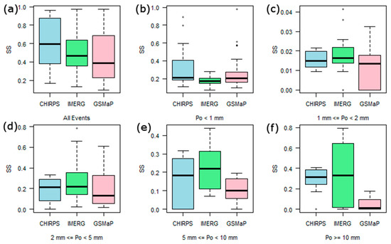 Box plots of Skill Score (SS) of the three satellite-based datasets in the estimation of rainfall amount for (a) all events, and (b–f) different intensity ranges as shown in the corresponding plot.