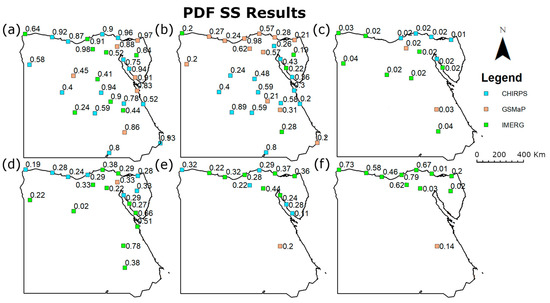 Maps showing the best performing datasets according to PDF SS at each station along with the estimated SS for best performing satellite rainfall product for (a) all rainfall events, (b) no/tiny rain, (c) light rain, (d) low–moderate rain, (e) heavy–moderate rain, and (f) heavy rain.
