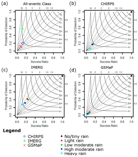The performance chart of CHIRPS, IMERG, and GSMaP in detecting (a) all-events class, and (b) CHIRPS, (c) IMERG, and (d) GSMaP in detecting rainfall events having different intensity ranges.