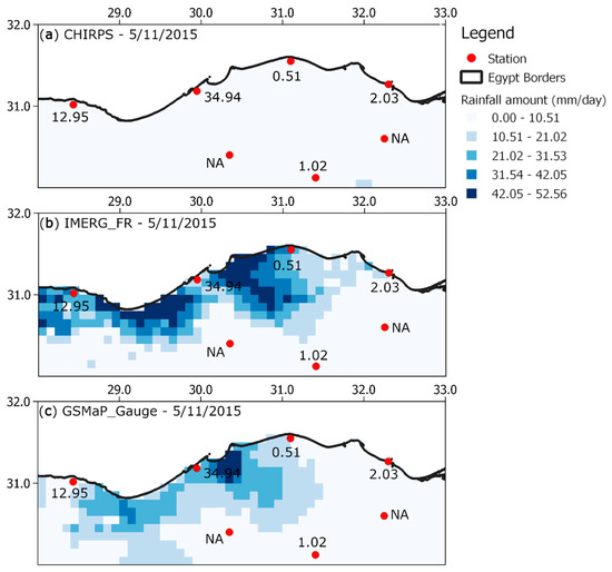 Spatial distribution of rainfall during the 5 November 2015 flash flood in the north of Egypt as captured by (a) CHIRPS, (b) IMERG, and (c) GSMaP along with observations at 7 nearby stations.