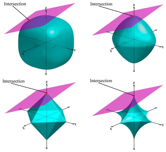 For the optimization problem in Equation (3), geometrically, the constraint is a hyperplane and the Lp-norm is a ball blown from the origin point. As shown in Figure 1, when the blown ball is in contact with the hyperplane for the first time, the intersection is the optimal solution of problem (3).