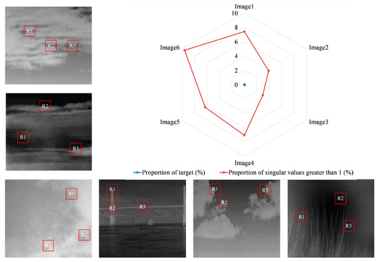 Figure 2 shows the proportion of singular values greater than one and the proportion of target pixels for different infrared images. In the figure, six infrared images are analyzed, wherein the marked regions R1 to R3 are patch images with relatively large background changes, and are also regions that make the low rank property of background image less stringent. In the radar chart, the red dots indicate the proportion of singular values greater than 1, and the blue dots indicate the proportion of targets. It is obvious that the blue dots are squeezed together because their value is much smaller than that of the red dots. This image also shows that the sparsity of the target should be stricter than the low rank property of the background.