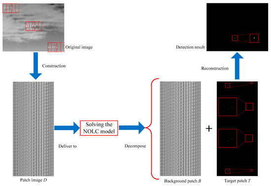Then, by transforming the original image with the sliding window into patch image, the sparsity of the target and the low rank of the background are enhanced. The model is transformed into Equation (9):