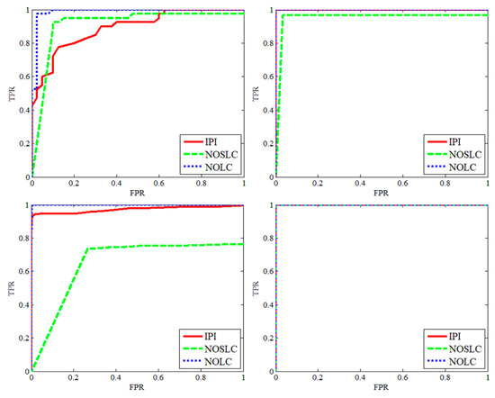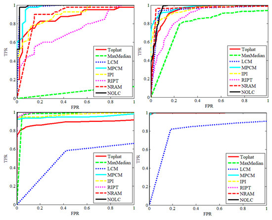 The ROC comparison chart for the seven algorithms for the above four sequences is given by Figure 16 where the black line represents the curve of NOLC. From the top left to the bottom right, they represent sequences 1–4. As can be seen from the figure, the NOLC curve can always achieve a TPR of 1 when the FPR is relatively small, which means that the AUC of the NOLC is larger. To better compare the AUC of each of the curves in Figure 16, their specific values are listed in Table 3, where the maximum value of each sequence AUC is indicated in red and the second largest value is indicated in purple. From Table 3 we can quantitatively observe that the AUC of NOLC is the second largest in Sequence 2 and 3, and the rest are the largest. Therefore, it can be said that NOLC's performance in the sequence image test is remarkable.