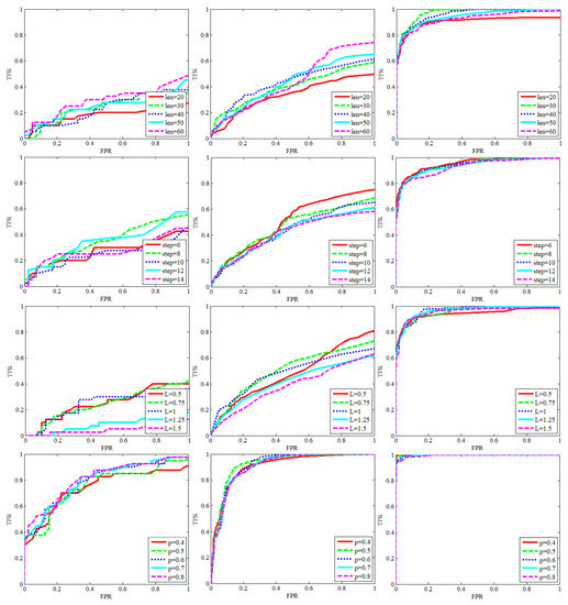 The ROC curve is widely used in the evaluation of two-class models and also in the field of infrared small target detection. It can quantitatively describe the dynamic relationship between the true positive rate (TPR) and false positive rate (FPR), and give neutral and objective suggestions when evaluating algorithms. The abscissa of the ROC curve is TPR, which reflects the proportion of the target being correctly detected; the ordinate is FPR, which reflects the proportion of non-targets being misdetected as targets. Therefore, the closer the ROC curve is to the upper left corner, the better the algorithm works. When the ROC curve is applied to infrared small target detection, the abscissa and ordinate are defined as follows: