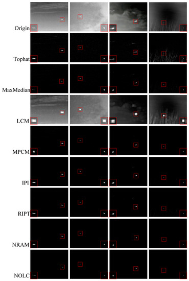 The above sections verify the effectiveness of the diverse scene and the proposed method, and discuss the setting of key parameters. In this section, we compare the NOLC algorithm with other detection algorithms. The parameter settings of the seven contrasting algorithms and NOLC are presented in Table 1. We compared the NOLC model to the Tophat method (Tophat), Max Median method (MaxMedian), Local Contrast Method (LCM), Multiscale Patch-based Contrast Measure (MPCM), Infrared Patch Image (IPI) model, Reweighted Infrared Patch Tensor (RIPT) model and Non-Convex Rank Approximation Minimization (NRAM). The effect of all algorithms on a single frame image is shown in Figure 12 and Figure 13.