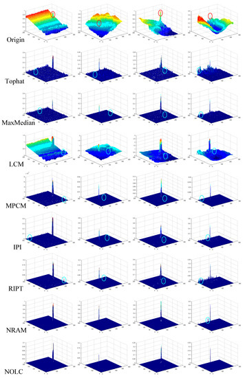 Figure 12 shows the processing results of the original image and the above seven algorithms. For better display, the target region is framed in red and enlarged to the corner of the image. Figure 13 is a 3D representation of the corresponding position image of Figure 12. As in the previous section, the target position in the original image is circled in red, and the position of the clutter is circled in cyan in the 3D display of processing result.