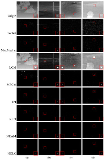 It can be seen from the experimental results that the background suppression based methods and the HVS based methods are very difficult to detect small targets in complex backgrounds. This is because the assumptions of the two methods are simple, and it is difficult to distinguish between clutter and target when encountering complex backgrounds. In contrast, because the assumptions of the sparse and low-rank matrices recovery based methods are supported by scientific physical models, they are superior in effect to other kinds of algorithms. However, there is still a lot of clutter in the processing results of IPI and RIPT. This is because the IPI model only limits the sparse item to a rough one, resulting in poor detection results. The RIPT method uses structural tensors to weight the sparse item, and the sparse constraints are still not strict, so the detection effect of RIPT is not ideal. As for the NRAM method, since the method only imposes constraints on the clutter, the contribution of this constraint to the detection effect is indirect, and the sparsity of the target is not strictly limited, so there is still clutter in the complex background. The NOLC method directly strengthens sparsely constrains and thus always finds sparse target locations in complex backgrounds, which explains why NOLC processing results have little clutter. This experiment also preliminarily illustrates the excellent robustness of NOLC.