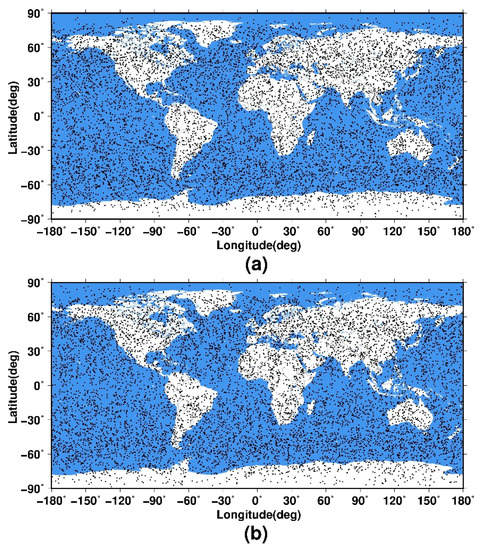 Figure 1 shows the distribution of the 24 h ROEs observed by COSMIC with five navigation satellite systems, including GPS, GLONASS, Galileo, BDS, and QZSS simulated based on their nominal constellation configurations. It should be mentioned that although COSMIC can only process the signals from GPS in practice, the number of ROEs can be expected to increase almost fourfold and better spatial and temporal distributions of ROEs will be acquired if the RO payload of COSMIC could track the signals from all the five navigation satellite systems. For the simulation of ROEs shown in Figure 1a, the real COSMIC orbits are applied. While for the simulation of ROEs shown in Figure 1b, the COSMIC orbits are simulated based on the initial satellite positions of the real orbits, using the Simplified General Perturbations Satellite Orbit Model 4 (SGP4) orbit propagator [45]. The number of the 24 h ROEs obtained based on the real and the simulated orbits is 10,317 and 10,340, respectively, with the relative difference of only 0.2%. It can be seen from Figure 1 that the distributions of the simulated 24 h ROEs in the two subfigures are very similar. Furthermore, the fitness value is 0.51968 and 0.51080 when the real and the simulated COSMIC orbits are used, respectively and the two values are very close to each other. These comparisons verify the effectiveness of the orbit simulation in this study.