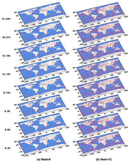 The spatial and temporal distributions of the ROEs observed by all the final optimized LEO constellations can be presented visually. Here, as representatives, the spatial distributions of the ROEs in 3 h intervals for one day, observed by the final optimized 2D-LFCs composed of 6 and 12 LEO satellites, are shown in Figure 5. It can be seen that as the number of satellites increases, the number of ROEs observed in each three hours increases accordingly. Independently from the number of satellites, the distributions of the ROEs observed by the optimized configurations within each 3 h are homogeneous over the globe.