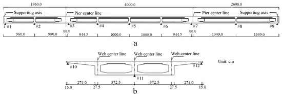 Built in 1996, the G6 motorway is one of the most important terrestrial modes of transportation in the northwest region of China. It has approximately 2618 km of transportation infrastructure (including pavements, culverts, and bridges) in use between Beijing and Lhasa. As shown Figure 1, the bridge used as the test subject in this study, Beishatan Bridge, is the way connected to the G6 motorway, which is located between the North Fourth Ring and the North Fifth Ring in Beijing. As shown in Figure 2, the Beishatan Bridge is composed of two sub-bridges, the right sub-bridge (direction to Beijing) and the left sub-bridge (direction from Beijing), which have the same length and width. As shown in Figure 3, a sub-bridge is an 86.58 m continuous girder bridge, which is divided into three spans, including a main span of 40 m and two side spans of 19.6 m and 26.98 m (Figure 3a). The width of the girder is 12.93 m, with three web center lines (Figure 3b). Aiming to safeguard the operational safety of this bridge, periodic monitoring was performed by a total station. As shown in Figure 3a, the nine monitoring points, 1 to 9, were designated on the lower surface of Beishatan Bridge along the vertical section. As shown in Figure 3b, three monitoring points were designated on the lower surface of the bridge along the cross section. However, in October 2016, the monitored results showed that a maximum deflection of approximately 8 cm occurred at the location of point 5 along direction of the web center line containing point 11 for the right sub-bridge, which was approximately 3 cm according to the last periodic monitoring. In order to avoid further deterioration of the right sub-bridge of Beishatan Bridge, the right sub-bridge of the Beishatan bridge was supported by jacks, as shown in Figure 2. Therefore, it is urgent to obtain an accurate damage area and the causes of bridge damage and to facilitate for bridge reinforcement and maintenance.
