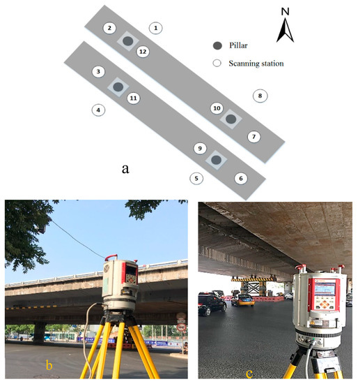 In this study, according to the previously monitored results by a total station, there was a maximum deflection of approximately 8 cm that occurred at the location of point 5 on the right sub-bridge. However, as shown in Figure 3, only nine monitoring points were designated on the lower surface of the Beishatan Bridge along the vertical section. It is difficult to fully reflect the deformation of Beishatan Bridge, and any monitoring technique needs to acquire accurate damaged location and deformation information with a millimeter scale accuracy. Therefore, with the advantages of a scanning speed of up to 300,000 points per second, a wide field-of-view of 60° × 360°, an angle resolution of up to 0.0005°, and a scanning accuracy of 5 mm within a range of 100 m, a TLS Riegl VZ-1000 (RIEGL Laser Measurement Systems GmbH, Horn, Austria) was used to perform deformation measurements to obtain the potential damage area for the main span of the Beishatan Bridge [35]. As shown in Figure 5a, 12 scanning stations were evenly designated around or under the bridge. Four of 12 points, namely points 1, 4, 5, and 8, were set around the bridge with a horizontal distance of approximately 8.2 m from the measuring center of the Riegl VZ-1000 to the bridge, as shown in Figure 5b, and eight other points were set under Beishatan Bridge, with a vertical distance of approximately 4.1 m from the measuring center of the Riegl VZ-1000 to the bridge and a horizontal distance of about 2 m from the measuring center of Riegl VZ-1000 to the Pillars, as shown in Figure 5c. The obtained point clouds from the 12 scan stations were registered using a Riscan Pro (a companion software for RIEGL Terrestrial 3D Laser Scanner Systems) with two steps. The first step was rough registration based on sampling consistency to provide initial estimation of rigid body transform by selecting at least four corresponding points between two adjacent scan stations; the second step was fine registration by using multi-station adjustment [36]. After that, a digital surface model (DSM) of the lower surface of Beishatan Bridge was constructed by using the registered point cloud, which can be used to acquire the potential damage area of the monitored bridge by using comparative analysis between the two sub-bridges. The area with a severe differential subsidence can be considered as the potential damage area of the monitored bridge.