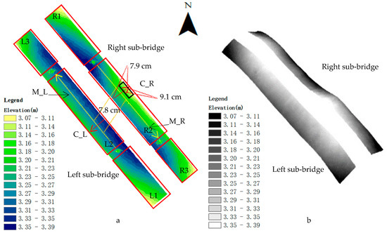 As shown in Figure 8, the DSM of the lower surface of the Beishatan Bridge was constructed from the point clouds obtained by TLS. The inspection of elevation of the lower surface of the Beishatan Bridge from this figure clearly highlights the following: (1) For the side-spans L1 and R1 of the left and right sub-bridges shown in Figure 8a, the average elevation values were 3.243 m and 3.242 m, respectively, and the trend of elevation of DSMs was basically consistent. Therefore, a conclusion can be made that damage did not occur in these two side-spans. (2) For the side-spans L3 and R3 of the left and right sub-bridges shown in Figure 8a, the trend of elevation of DSMs was basically consistent, but the average elevation value was 3.226 m for the right sub-bridge, which was less than the 3.241 m of the left sub-bridge. These results showed that the overall subsidence may have occurred in the right sub-bridge. (3) For the mid-spans L2 and R2 of the left and right sub-bridges, as shown in Figure 8a, the average elevation values were 3.281 m and 3.234 m, respectively. There was an average elevation difference of approximately 5 cm. Furthermore, the trend of elevation of DSMs was inconsistent for the left and right sub-bridges. As the trend of the designed elevations is a gradual process like the left sub-bridge shown in Figure 8 and is basically the same for the left and right sub-bridges, there was a differential subsidence in the mid-spans of the right sub-bridge. Generally, differential subsidence may cause cracks in the surface of the monitored bridge [26]. However, as shown in Figure 9, there are no cracks in the lower surface of the right sub-bridge; therefore, some damage may have occurred inside the mid-span of the right sub-bridge, which is in the initial stage of bridge damage. The results demonstrate that the TLS technique is an effective technique to find out the potential damage area of the monitored bridge caused by differential subsidence, whether there are cracks in the bridge surface or not, which is a great advantage compared with the traditional point-wise surveying methods. However, it is difficult to acquire the potential damage area caused by the abnormal stress of the foundation structure and the tilting and sliding of the bridge foundation.
