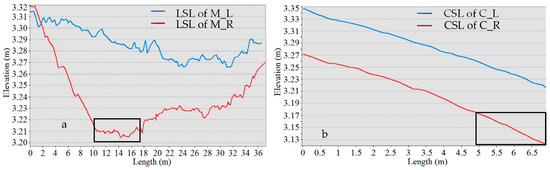 In order to obtain the maximum deformation region of the mid-span of the right sub-bridge, and further determine the potential damage area for dynamic time-series displacement acquisition by ground-based microwave interferometry, a longitudinal section line (LSL) and a cross section line (CSL) were extracted from the DSM of the lower surface of the Beishatan Bridge, as shown in Figure 10. The elevation changes from this figure clearly highlight the following: (1) As shown in Figure 10a, an LSL along the midline of each bridge (yellow dotted line in Figure 8a) was extracted from the DSM of the left and right sub-bridges. Compared with the left bridge, there is an obvious deformation that occurred in the right sub-bridge, with an average difference of approximately 5.4 cm. Especially, in the range of approximately 10–18 m along the midline of the bridges, shown as the black box in Figure 10a, the average elevation difference is was as high as approximately 7.8 cm, which can be regarded as a potential damage area. (2) As shown in Figure 10b, aiming to determine the accurate damage area, a CSL (red dotted line in Figure 8a), located at 14 m along the direction of the LSL of each bridge, was extracted from the DSM of the left and right sub-bridges. Obviously, there was a greater elevation difference between the CSLs of C_L and C_L of the two bridges, with an average elevation difference of approximately 7.9 cm, especially for the outer side of the bridges shown in Figure 10b as the black box; the elevation difference was gradually increased up to 9.1 cm. Therefore, the outer side of the right sub-bridge in the range of approximately 10–18 m along the midline of bridges is the most likely damage area, as shown as the black box in Figure 8a.