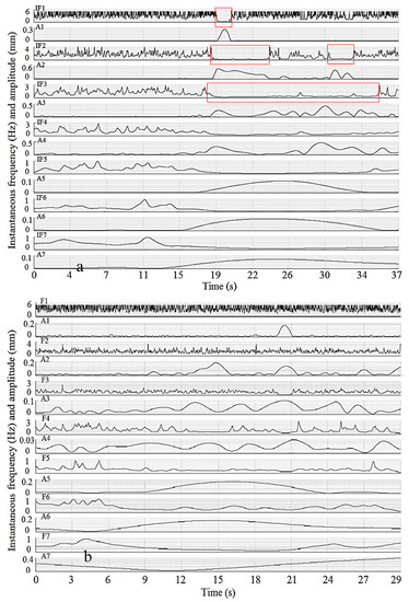 For the purpose of detecting damage from the above potential damage area for the right sub-bridge, a dynamic time-series displacement with a duration of about 37 s, named “Data”, shown in Figure 11a, was obtained by ground-based microwave interferometry in this area; this analysis was undertaken with the transient load of vehicles. Moreover, aiming to make a comparison analysis between the right and the left sub-bridges, a dynamic time-series displacement with a duration of about 29 s, named “Data” shown in Figure 11b, was also obtained by ground-based microwave interferometry for the left bridge in a similar area, as shown in Figure 6. Furthermore, as shown in Figure 11, each set of dynamic time-series displacements was decomposed into seven IMF components (IMF1–IMF7) by use of the ESMD method. The inspection of the IMFs in this figure clearly highlights the following: (1) For the right sub-bridge, there were two obvious variations that appear on the curve of the dynamic time-series displacement, as shown in Figure 11a; the maximum displacements were approximately 0.78 mm and 1.26 mm, which may be caused by the different speeds and weights of the vehicles passing through the bridge. For the left bridge, there were also two displacement variations appearing on the curve of the dynamic time-series displacement, as shown in Figure 11b. However, the maximum displacements were approximately 0.62 mm and 0.41 mm, which were smaller than those of the right sub-bridge. Although different speeds and weights of the vehicles passing through the bridge lead to different maximum displacements, these results also indicate that the right sub-bridge may be more damaged than the left bridge. (2) For the decomposed IMF1 to IMF3 of the right sub-bridge, the displacement variation was in the interval of −0.5 mm to 0.5 mm, which was larger than that of the other four decomposed IMFs. Moreover, there were some obvious sudden variations appearing on the displacement curves of IMF1 to IMF3. These results showed that the decomposed IMF1 to IMF3 are the main components of the original dynamic time-series displacement of the right sub-bridge. Similarly, the decomposed IMF1 to IMF3 of the left bridge are also the main components of the original dynamic time-series displacement.