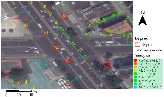 Permanent scatterer (PS) deformation rate map of the whole image in the test area.