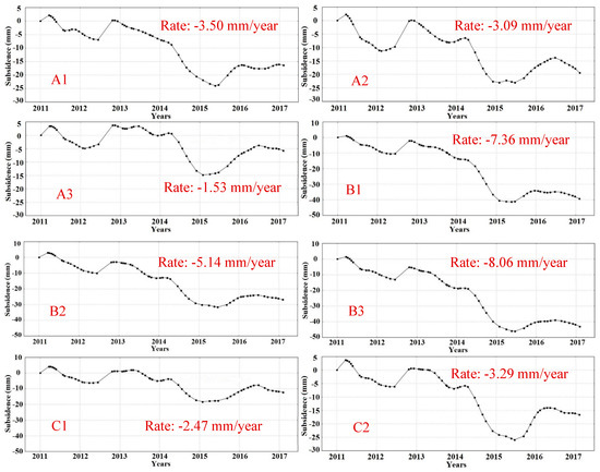 In order to analyze the reasons for damage of the right sub-bridge of the Beishatan Bridge, the ground surface subsidence of key locations around the Beishatan Bridge were obtained by using the PS-InSAR technique, based on 61 SAR images from 2011 to 2017. As shown in Figure 13, eight key locations were selected around the Beishatan Bridge to perform the analysis. Three of them, locations A1 to A3, are in the front, middle, and rear positions on the east side of the right sub-bridge. Locations B1 to B3 are in the left, middle, and right positions on the north side of the Beishatan Bridge, and locations C1 and C2 are in the left, middle, and right positions on the south side of the Beishatan Bridge. The corresponding subsidence curves of the eight locations are shown in Figure 14, and the average subsidence rate of each location is also calculated according to the time interval and subsidence difference between the first and last images [29]. The inspection of the subsidence curves and average subsidence rates of the eight locations in these figures clearly highlights the following: (1) The average subsidence rates at locations A1 and A2 are −3.50 mm/year and −3.09 mm/year, which are greater than the values of location A3, which has a subsidence rate of −1.53 mm/year. Moreover, as described in Section 4.1 and Section 4.2, the damaged location of the right sub-bridge of the Beishatan Bridge is between locations A1 and A2. This indicates that ground subsidence may be one of the main reasons for the cause of damages to the right sub-bridge of the Beishatan Bridge. (2) The average subsidence rates at locations B1, B2, and B3 are −7.36 mm/year, −5.14 mm/year, and −8.06 mm/year, respectively. Meanwhile, the average subsidence rates at locations C1 and C2 are −2.47 mm/year and −3.29 mm/year, respectively. Therefore, compared with the south side of the bridge, there is a significant subsidence on the north side of the bridge, which is close to the damaged location of the right sub-bridge of the Beishatan Bridge. These results further indicate that ground subsidence is one of the main causes of damages to the right sub-bridge of the Beishatan Bridge. (3) Moreover, although the subsidence rate of each location is different for each of the eight locations, the variation trend of the eight subsidence curves is basically the same. Especially from the end of 2012 to early 2015, there has been an obvious sharp decrease in all the eight subsidence curves. Therefore, the larger ground subsidence during this period may be the main factor for the damage to the Beishatan Bridge.