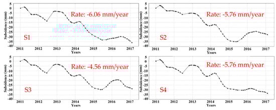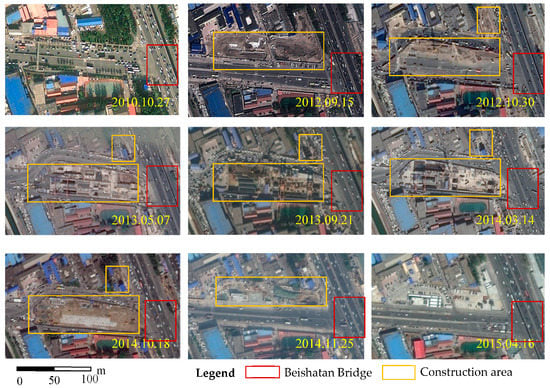 As shown in Figure 15, there is a subway station on the west side of the Beishatan Bridge. Therefore, four key locations, named S1 to S4, were selected for use in a subsidence analysis related to bridge damage. As shown in Figure 16, the average subsidence rates are −6.06 mm/year, −5.76 mm/year, −4.56 mm/year, and −5.76 mm/year for locations S1 to S4, respectively. They all have a greater subsidence rate, which is close to the value of locations B1 to B3. Moreover, the variation trends of the subsidence curves of locations S1 to S4 are also the basically same as those of the other eight locations around the Beishatan Bridge, which also have an obviously sharp decrease from the end of 2012 to early 2015. Furthermore, aiming to find the main factor causing ground subsidence from the end of 2012 to early 2015, and according to the collected nine images of the Beishatan Bridge at different times from the end of 2012 to early 2015, shown in Figure 17, the subway shield construction period was from September 2012 to December 2015. Obviously, the subway shield construction period is consistent with the timespan of sharp decrease of the subsidence curves for all the above locations. Moreover, as shown in Figure 14, the subway station included four subway exits, S-A, S-B1, S-B2, and S-C. Two of them, S-B1 and S-B2, are at the north side of the Beishatan Bridge. Therefore, the subway shield construction period may be one of the main factors causing the larger ground subsidence for the north side of the Beishatan Bridge, which can cause bridge damages. Moreover, as shown in Figure 14 and Figure 16, there is an obvious uplift in all of the subsidence curves between 2012 and 2013, which was caused by the support structure construction at the beginning of the subway shield construction. The results showed that PS-InSAR, because it has advantages in long time-series, a large scope, and dense 3D measurement, is an effective and reliable technique to analyze the cause of bridge damage caused by differential ground subsidence. However, if the bridge damage is not caused by the differential ground subsidence around the monitored bridge, it is difficult to analyze the causes of bridge damage using the PS-InSAR technique. Moreover, if the terrain around the bridge changes dramatically, it is also difficult to acquire enough PS points to analyze the causes of the bridge damage [47].