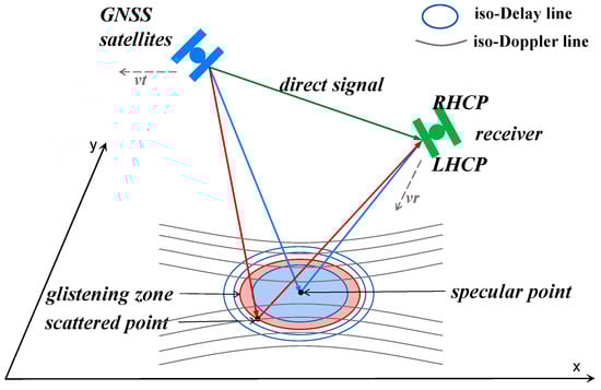 Due to the roughness of the land or sea surface, the signal received by the receiver includes the energy reflected from the scattering point. The scattered points locate in the area called glistening zone, and its size is related to the sea surface roughness and the height and elevation angle of the receiver. In the glistening zone, since the positions of the GNSS satellites and receivers are constantly changing, each scattering point corresponds to a different Doppler shift and delay, as shown in