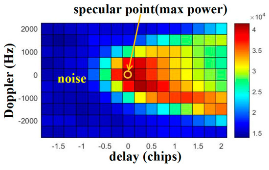 Figure 2, the delay and Doppler resolution are 0.25 chips (1 chip=1/1023000 s) and 500Hz, respectively. The default Doppler and delay of specular point is 0 chip and 0 Hz, as the reddest grid represents the specular point which has the maximum power, and the less powerful blue area is considered the noise floor.