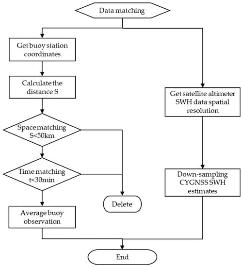 19]. The spatial resolution of the CYGNSS SWH estimate obtained in this paper is 0.25° × 0.25°, which are down-sampled to match the satellite altimeter data spatial (1° × 1°). The matching process is shown in