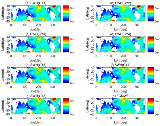 The CYGNSS significant wave height (SWH) estimates compared with the European Centre for Medium-Range Weather Forecasts (ECMWF) SWH model on 1 April 2017 (including CY1, CY2, CY3, CY4, CY5, CY7, and CY8 satellites).