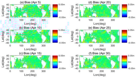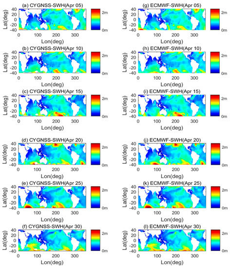 Figure 7 shows a comparison of the SWH values estimated from CYGNSS and the ECMWF model in April 2017 (sampled every 5 days). It can be seen that the estimation results are in good agreement with the model. Close to the equatorial region, the SWH of the sea surface is about 2.5m, but the SWH is lower in the Indian Ocean. Large SWH values mainly occur in high latitudes, especially in the southern latitudes. Due to the covering limitation of CYGNSS orbit, we cannot estimate the SWH of the Arctic Ocean or the sea around Antarctica.