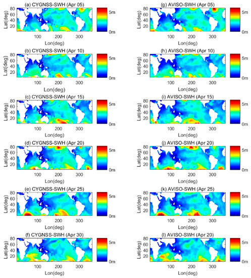 Figure 10 that there is a highly similar distribution between the CYGNSS SWH estimate and the AVISO SWH observation in April 2017.