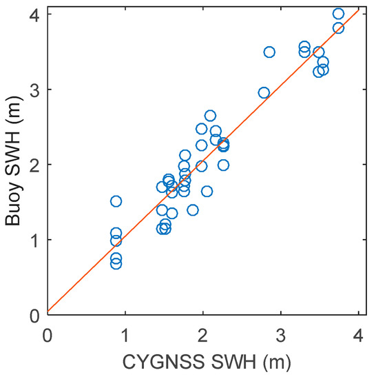 Table 3, the CYGNSS SWH estimate has a small deviation from the buoy SWH observation with 5 cm, and the RMSE is 0.2761. The correlation coefficient is 0.9539, which shows a good correlation between the CYGNSS SWH estimation and the buoy observation.