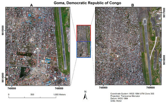 For the experiments, an aerial VHR multispectral image acquired over Goma City, the Democratic Republic of Congo, in 2018 is used as shown in Figure 1.