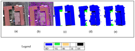 Illustration of the FCN_obia. In (a), the raw image tile is presented, in (b) the segments from OBIA are overlaid over the raw image, in (c) the reference map is shown, in (d) the FCN classified map is shown, in (e) the majority class of pixels from the classified FCN map is assigned to each segment to give a refined map. The classes shown in the legend are: BD-building, VG-vegetation, BS-bare soil, IS-impervious surface and SH-shadows.