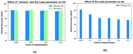 A chart illustrating influence of both scale and the minimum number of pixels in a segment on the overall accuracy (OA) of the FCN_obia approach in (a) and the influence of only the scale parameter in (b).