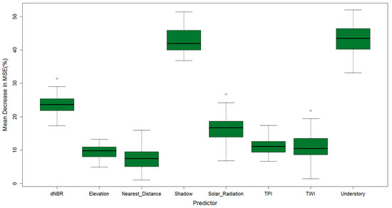 Because WorldView-2 derived PPCT was the most predictive indicator for both LAI and TSA, and LAI and TSA are highly correlated with each other, the RF model produces the same results for both LAI and TSA. Thus we only represented the RF model results for LAI. The 50 RF models explained a maximum of 62.4% (Mean R2 = 55.5%, SD = 3.0%, MSE = 0.382, N = 50) of the variation in estimated LAI. The coverage of understory vegetation and shadow pixels were the top-two most important predictor variables, decreasing MSE about 43.3% (SD = 4.6%) and 42.89% (SD = 3.8%) respectively when incorporated in RF models (Figure 6). The dNBR contributed about a 23.4% (SD = 2.9%) decrease in MSE, while contributions of topography variables ranged from 9.6% to 16.7%, followed by Solar Radiation (SD = 3.7%), Topographic Position Index (TPI) (SD = 2.3%), TWI (SD = 3.9%) and Elevation (SD = 2.1%). The edge effect was found to be the least important factor, contributing about a 7.2% (SD = 3.2%) decrease in MSE.