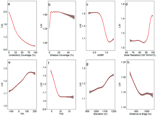 Topography is usually considered an environmental filter because it theoretically determines the drainage, thermal, solar radiation, surface roughness and other site factors which are usually exert considerable influence on tree species distribution and growth [87,88]. Total solar radiation during the growing season is typically the most important topographical factor and we found that LAI increased significantly when solar radiation exceeded 90,000 WH/m2 (Figure 7d). At our study site, southern slopes and flat areas favored broad leaf tree species, such as white birch and aspen, that can regenerate through roots sprouting [21,47]. The TPI, TWI and elevation shared similar relative importance. Higher TPI indicates higher slope position (Figure 7e), and thereby sites that tend to have good drainage and open space to accept seed rain, especially low weight seeds of white birch and aspen dispersed via wind.
