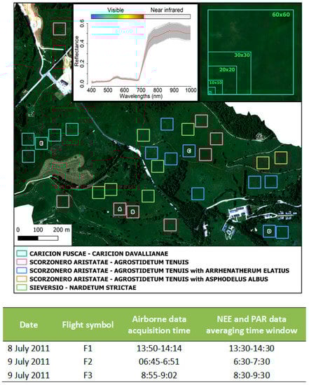 The scale-dependency of BPRs is under intense debate [,,]. Remote Sensing (RS) techniques provide strong potential for across-scale BPRs spatial patterns investigations: Since ground surveys are time-consuming and costly, larger areas can be analyzed using remotely-sensed proxies of diversity and productivity, leading to innovative insights in ecological applications. However, only sporadic experimental RS studies have been carried out to analyze the scale-dependency of optical diversity and productivity relationships. Airborne hyperspectral sensors are able to retrieve and combine detailed information on biochemistry and structure and represent a solid basis for across-scale investigations and for the validation of existing and upcoming satellite observations [].
