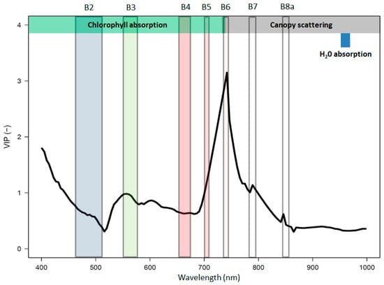 Variable importance of projection (VIP) statistics for the modeling coefficients of partial least squared regression (7 components; R2 = 0.95; RMSE 10.25%) based on AisaEAGLE ROI reflectance data (circular ROIs with a radius of 30m), fitted to the Eddy Covariance measured Net Ecosystem Exchange (NEE). The Sentinel-2 bands used in the study are highlighted, as well as the chlorophyll absorption, the leaf and canopy scattering ranges [], and the NIR water absorption peak [].
